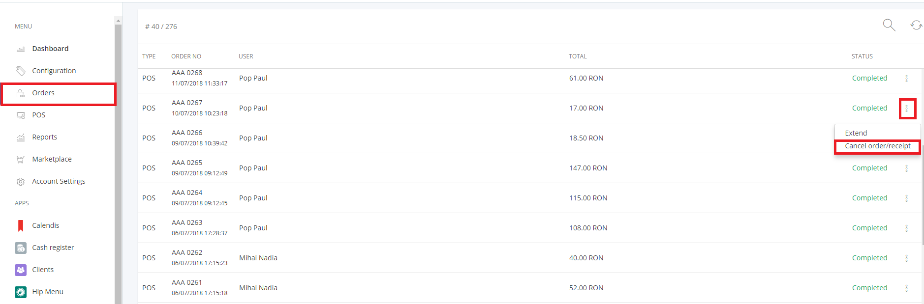 From the Menu, select Orders and look for the receipt that you need to cancel.