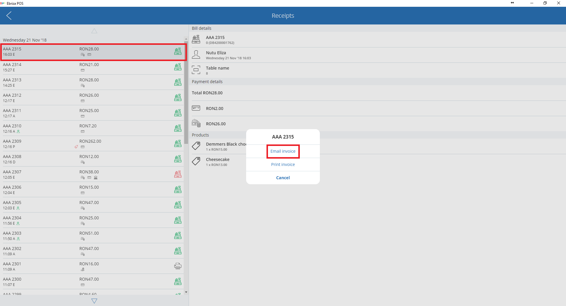 After issuing a fiscal receipt, the specific invoice can be sent via email to the customer. To send the invoice, go to the Receipts menu in the POS and follow these steps: