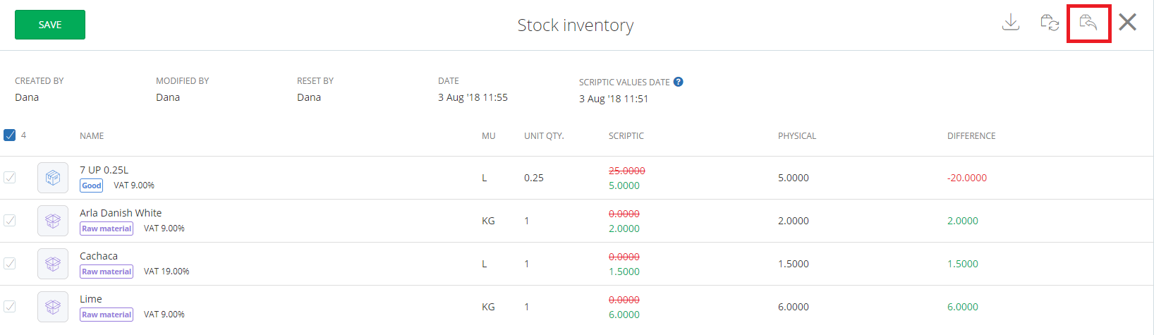 However if you need to make any changes for this inventory, you can undo the reset and add new values, if needed by selecting the stock and click on the undo icon found in the top right corner.