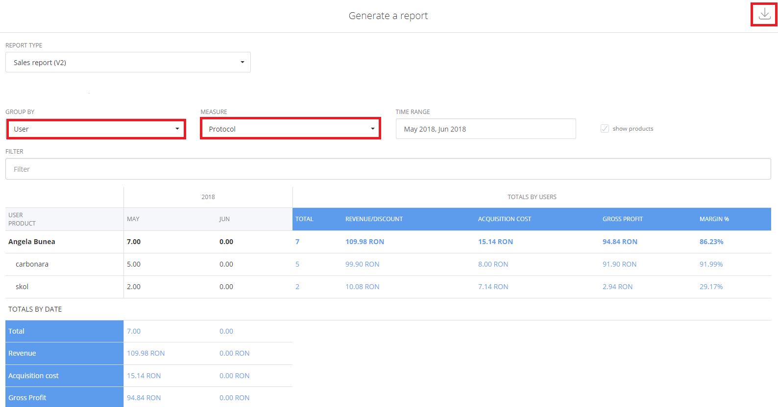 Since all products that are sold as protocol are per user, as group you will select to group by: User and as a measurement you will measure by: Protocol